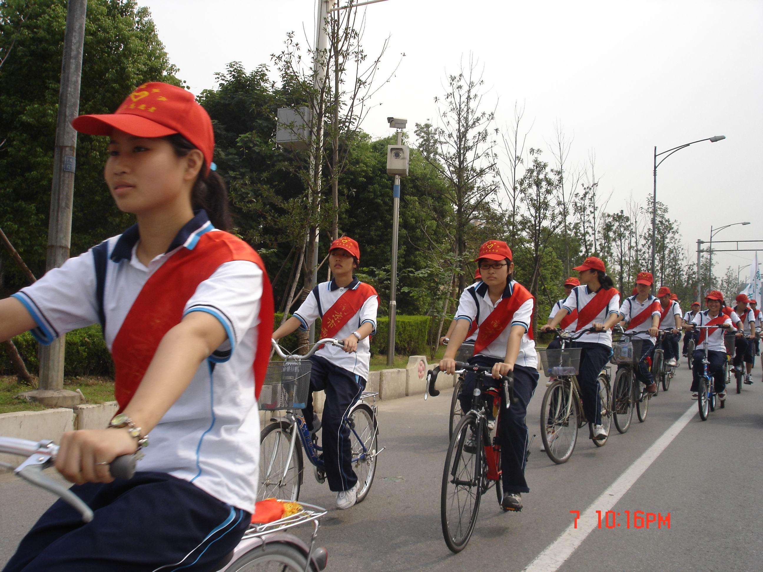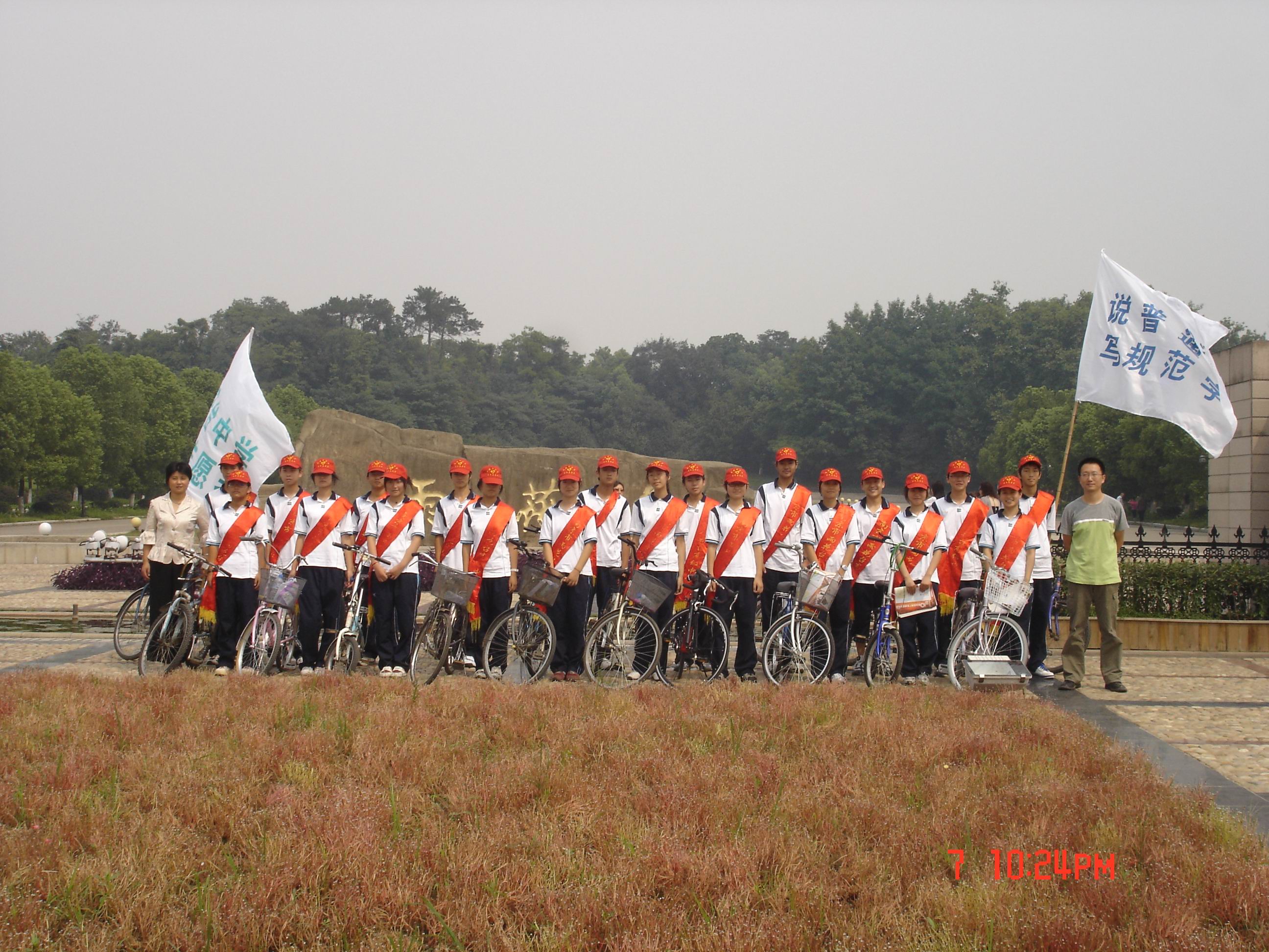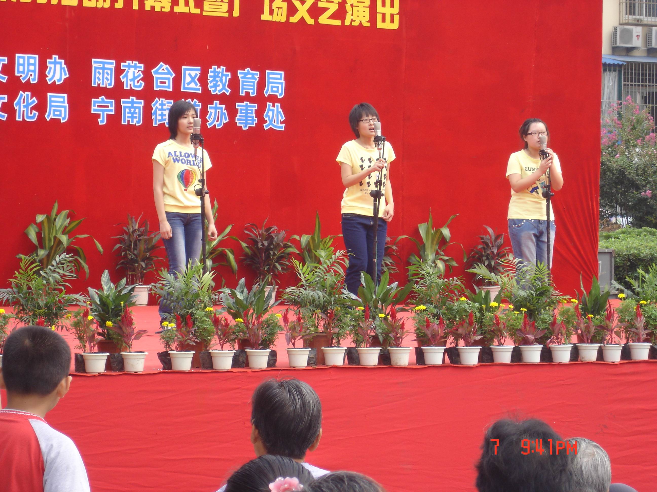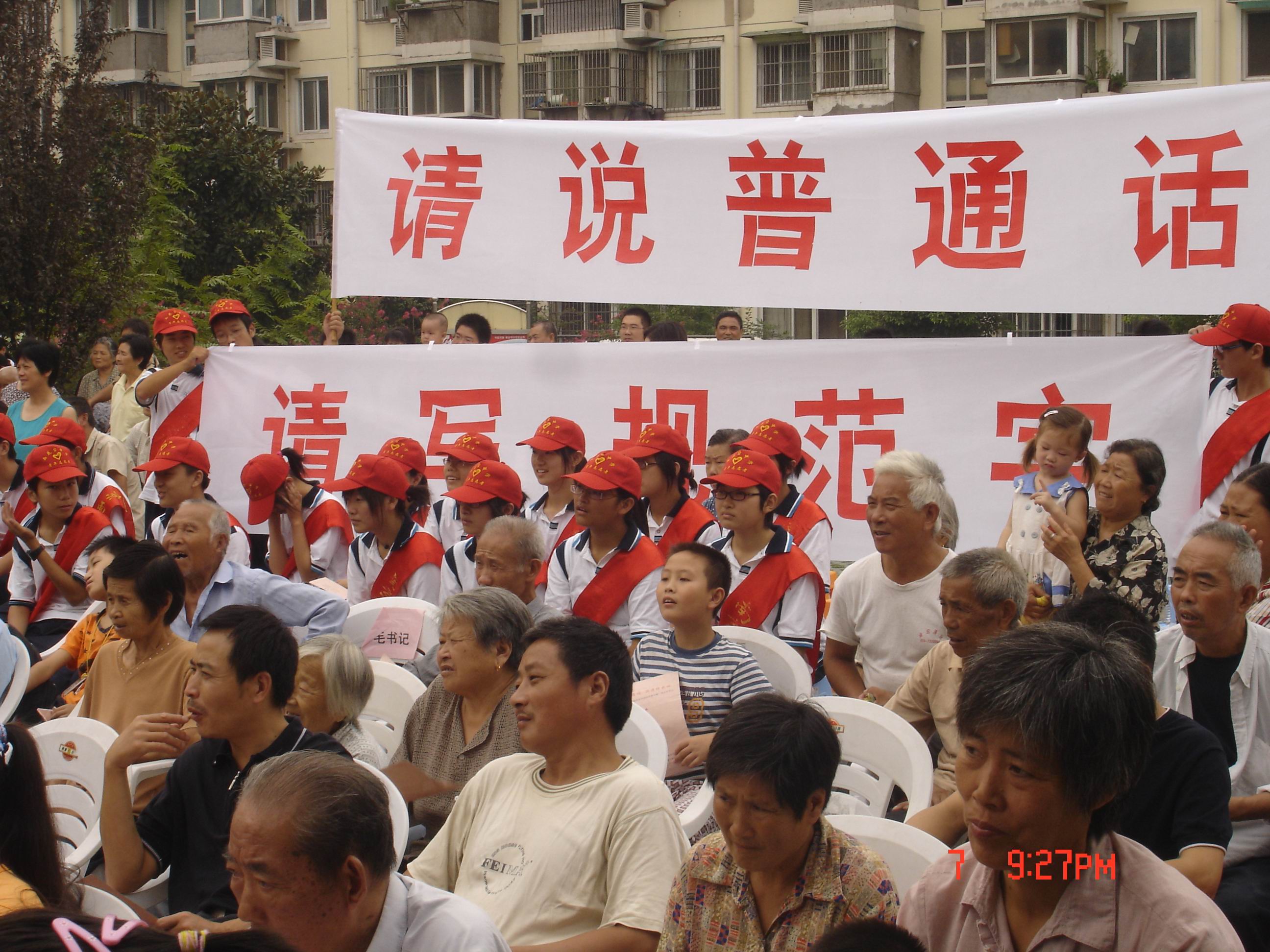2007年9月8日上午, 由来自我校高一(5)班的20名同学组成的青年志愿者推广“普通话、规范字”的宣传队在班主任曹小民老师的带领下来到了位于丁墙社区的郁金香花苑,参加了我区为迎接第十个全国普通话推广宣传周而举办的“推广普通话,沟通你我他”的大型文艺演出暨宣传周的启动仪式。
