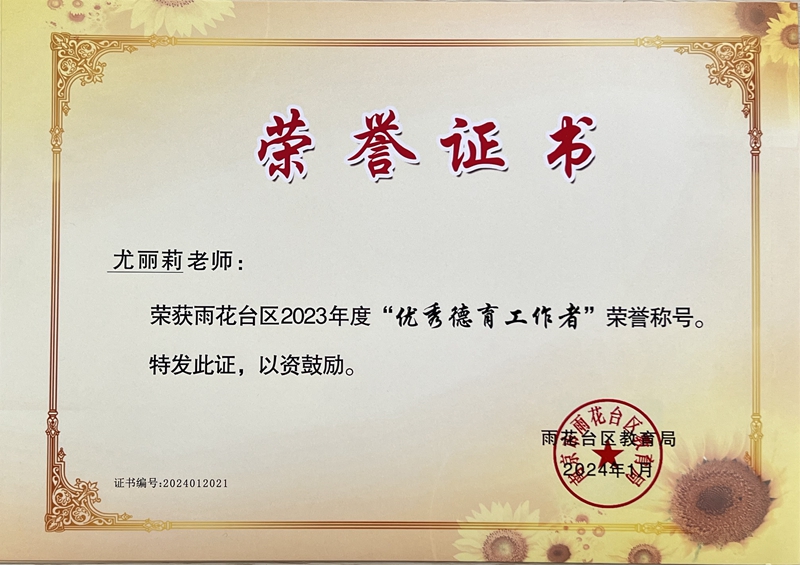 【喜报】我校尤丽莉老师荣获雨花台区2023年度“优秀德育工作者”称号