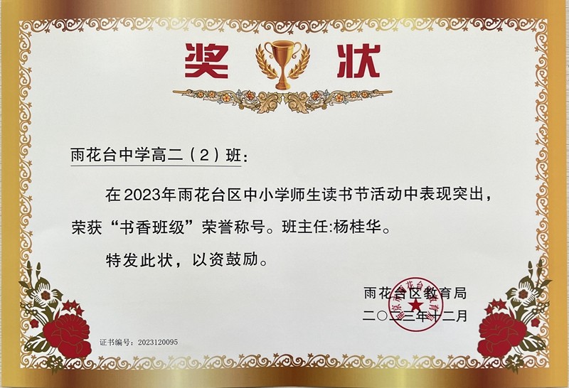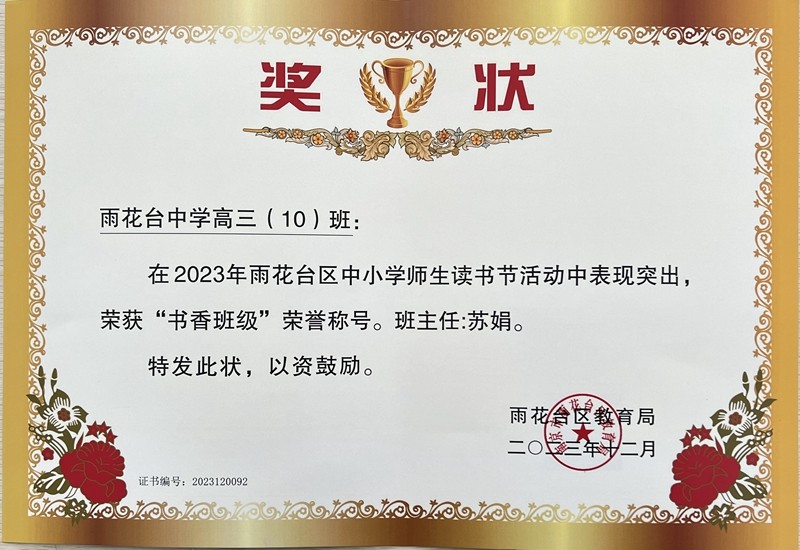 【喜报】我校高一(5)班、高二(2)班、高三(1)班、高三(10)班在雨花台区2023年度中小学读书节活动中荣获“书香班级”称号