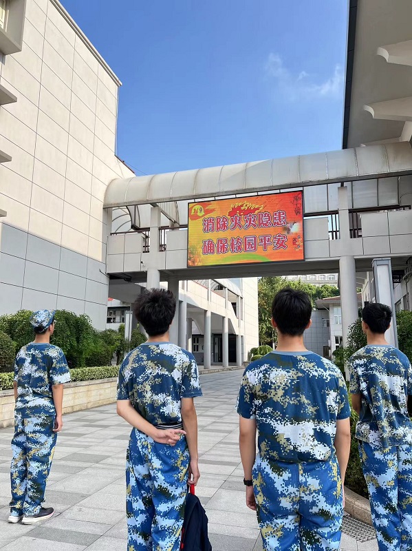 同学们通过在军训期间观看校园消防安全主题展板,消防教育电子屏等方式学到了在危险环境中迅速逃生、自救、互救的基本方法。