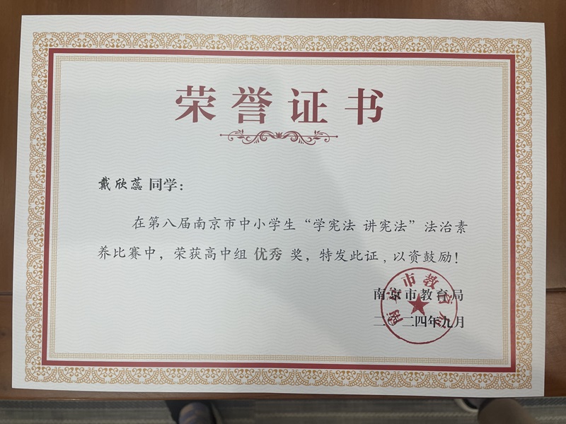 【喜报】戴欣蕊同学在第八届南京市中小学生“学宪法 讲宪法”法治素养比赛中喜获佳绩
