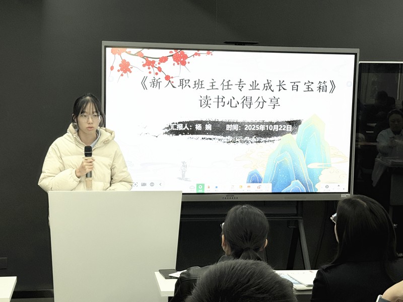 然后,杨婉老师从自身的班级管理经验出发,与班主任们一起分享《新入职班主任专业成长百宝箱》这本书的读后感悟。杨老师认为年轻班主任怀着一腔热血投入班主任工作,要做到以下几点,一要把握正确的方向,否则就是南辕北辙,越勤奋越偏移正确的轨道。二要弄清时间安排,做到井井有条,有效地支配时间。三要重视工作留痕,做好材料的梳理和总结。四要修炼班主任专业发展需要的六大基本技能:一,跟学生谈话的技能;二,与家长交往的技能;三,建设班级团队的技能;四,上好班会课的技能;五,创建班级文化的技能;六,转化问题学生的技能。只有这样,才能成为内心丰盈的班主任。