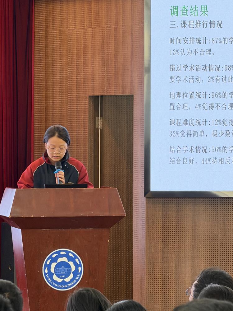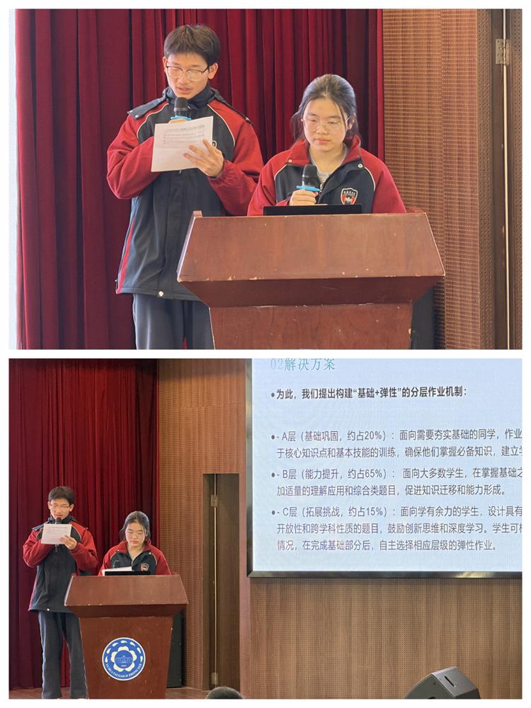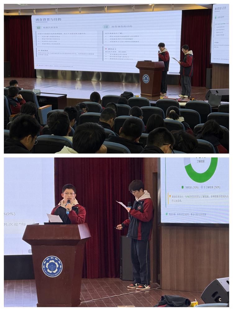 随后,六组第十五届学生校长助理按顺序依次上台,分享了各具针对性的调研成果:高三(10)班李沐蓉与高三(8)班王绍齐展示了学生对红色文化认识程度的调查结果;高三(2)班沈之韵与高三(9)班徐紫嫣围绕高中生学习压力问题进行了深入分析;高三(6)班陶明怡与高三(10)班刘欣妍针对社团课程现状提出了优化思考;高三(8)班颜语与高三(1)班彭欣怡关注学生物品丢失情况并给出了改进建议;高三(6)班余晨曦与高三(2)班雷鸣樾就校报发展相关问题形成了调研结论;高三(7)班赵思研与高三(4)班殷光泽则围绕高中生作业分层机制进行了探讨。各组汇报紧扣校园实际,兼具实用性与创新性,赢得现场广泛关注。