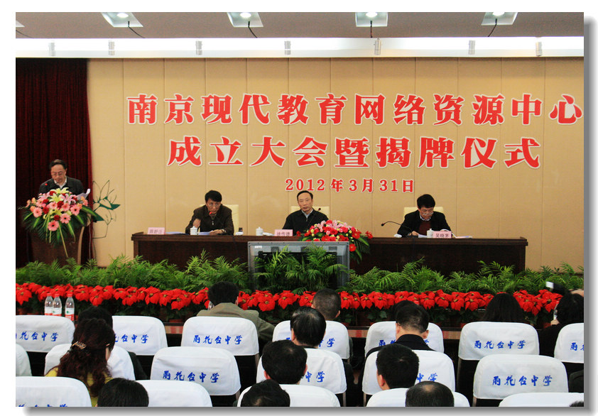 3月31日下午,“南京现代教育网络资源中心”揭牌仪式在我校和谐厅隆重举行。市教育局工委书记徐传德、局长吴晓茅、副局长陈泛舒等领导在主席台就坐。徐书记与吴局长共同为市现代教育网络资源中心揭牌。雨花台区教育局工委书记、我校校长穆耕森作为南京市数字化校园建设优秀学校的代表上台发言,穆校长对我校数字化校园建设的成果进行了回顾,并向与会领导与各兄弟学校就我校未来数字化校园建设的蓝图进行了汇报交流。