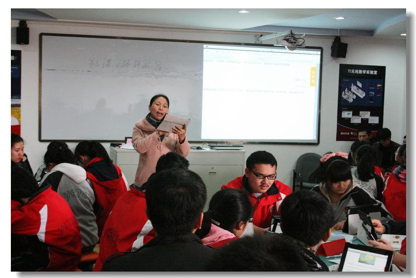 活动中,穆耕森校长参与了听课交流活动,并做了热情洋溢的讲话。周茜常务副校长介绍了近年来学校“数字化校园”建设的推进成果,无线网全覆盖、6000个G的资源库、学校外网、OA协同办公平台及师生交互空间等平台建设以及38台分布于教室走廊的“公共区域交互学习终端”的建成,丰富了学生课外学习与互动的空间,引领着我市“数字化校园”的建设。信息技术处史成宝主任介绍了学校“师生交互空间”平台的个性化、互动性的特点和应用,受到一致好评和关注。网络环境下的“师生交互空间”的搭建与IPAD移动终端的结合,进一步扩大了数字化学习的多样性、多模式,也推动了新型课堂教学模式的探索。