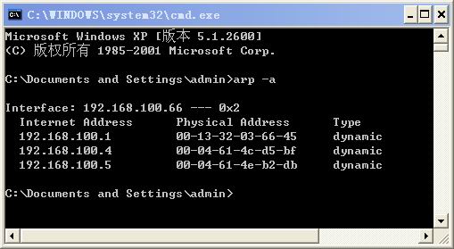 这是个运行正常的局域网,未受到ARP病毒的欺骗,这里网关的IP地址是192.168.100.1,MAC地址是:00:13:32:03:66:45。