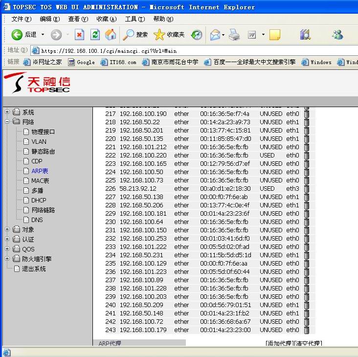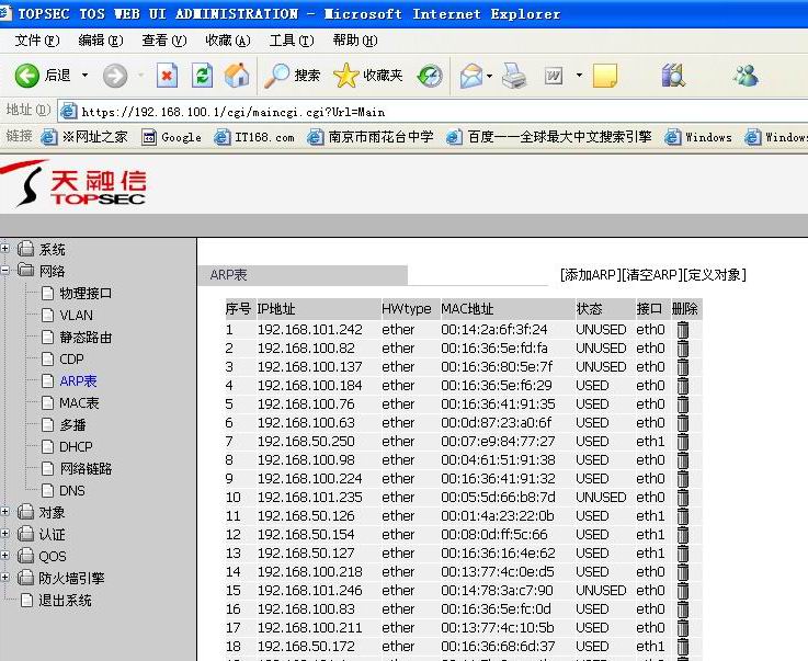 2、使用硬件防火墙做网关设备的局域网,可在出现大面积无法上网故障时登录防火墙,并使用show arp命令,有些防火墙还提供web管理方式,如图2所示。进入网络选项,打开arp表,若发现有多个IP地址与某个MAC地址对应的,毫无疑问那就是网络中有ARP地址欺骗,只需在局域网主机资料的电子文档中查出该MAC地址对应的使用者,将其从网络中断开,同时清空防火墙的arp缓存,故障随即消除。