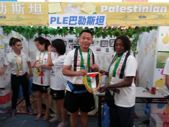 上午10时许,巴勒斯坦体育代表团团长Ruqaya一行高兴地来到我校亚青文化小屋,Ruqaya女士代表巴勒斯坦体育代表团向学校赠送了珍贵的巴勒斯坦体育代表团团旗和象征中巴友谊的徽章,还有富有特色的巴勒斯坦方巾,并给我校小屋的每位文化教育代表赠送了具有鲜明巴勒斯坦国家特色的围巾。巴勒斯坦运动员身着“我爱中国”的文化衫来小屋活动,并带来多首巴勒斯坦民族歌曲和我们大家分享,听到高兴时巴勒斯坦女运动员带领我们一起跳起巴勒斯坦民族舞蹈,现场活动气氛达到高潮。双方约定等2014青奥会的时候来一同布置巴勒斯坦文化小屋,以后多加强双方文化交流与联系,行为要赶航班,团长Ruqaya女士一行依依不舍地向大家一一道别。