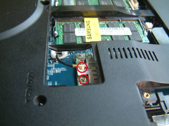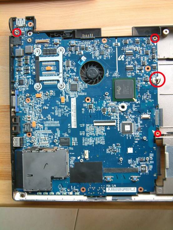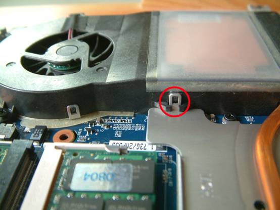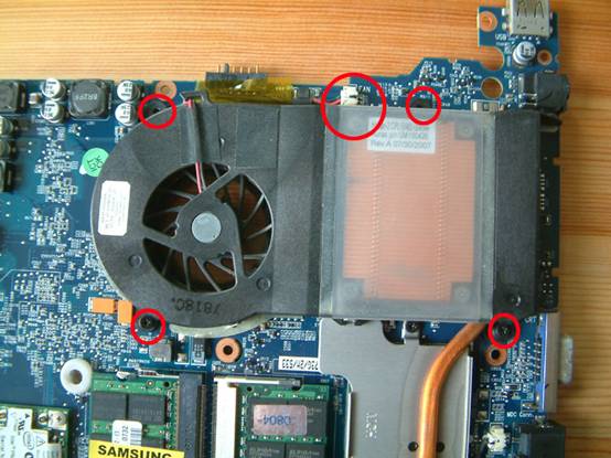 先把下图中所示的四个螺丝拆下来收好,再把大圆所示处的风扇电源线取下,这是插针,取法和刚才取扬声器插针的方法一样,可是,这边手不好操作啊,那就用两个小一字螺丝刀从插针的两边同时往外撬,很容易的,但要注意不能碰到主板上别的元件。再把那一片黄绿色的塑料胶带处理一下,就可以把电源线解放出来了。