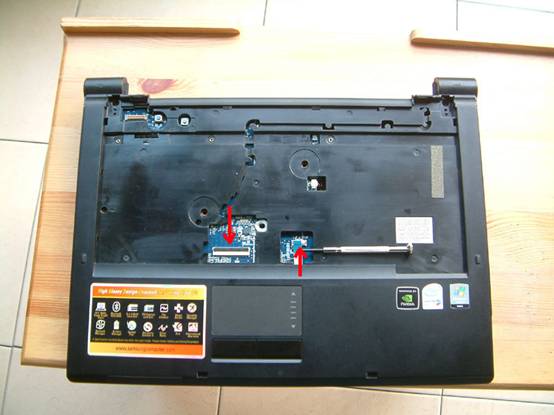 这是主机。好丑哦。注意螺丝刀那个地方是触摸屏和主板连接的排线,在拆卸上面板之前要把它先解决掉。硬拔?不行!也是压扣式的?答对了!看,左边键盘排线的样子还摆在那呢。只不过呢,这两个压扣的方向正好是相反的。