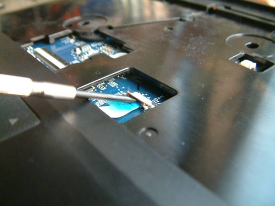 撬开这三个点,把键盘的整个下边撬出来,向下轻轻一拉键盘就下来了,但是键盘的上边一出来就别再拉了,因为键盘下还有数据线,数据线不是硬拔的,是那种压扣式的,用小一字螺丝刀轻轻向上一撬,就可以把键盘数据线拿下来了,键盘就彻底和主机分离了。