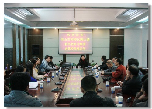 2013年11月26日下午,佛山市南海区狮山镇特色教育考察团一行30人来我校交流访问。代表们先是在信息技术处史成宝主任的陪同下参观了美丽的高中校园;接着在第二会议室,我校常务副校长周茜向来宾们介绍了我校数字化校园建设的概况;随后,信息技术处胡艳丽老师和史成宝主任分别向来宾们介绍了我校数字化校园建设的具体细节与落实情况,并与来宾们作了深切的交流。最后,大家合影留念。
