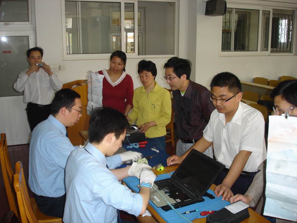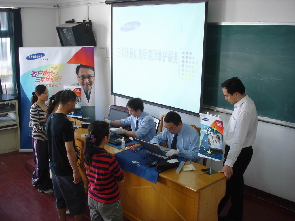 5月6日上午,韩国三星公司在我校北校区电化教室开展了售后服务工作,对20台三星笔记本电脑的键盘与液晶屏进行了全面清洗与检测,同时还对8台惠普笔记本电脑、11台明基笔记本电脑、4台索尼笔记本电脑的屏幕与机身进行了清洗,受到了学校老师们的热烈欢迎。