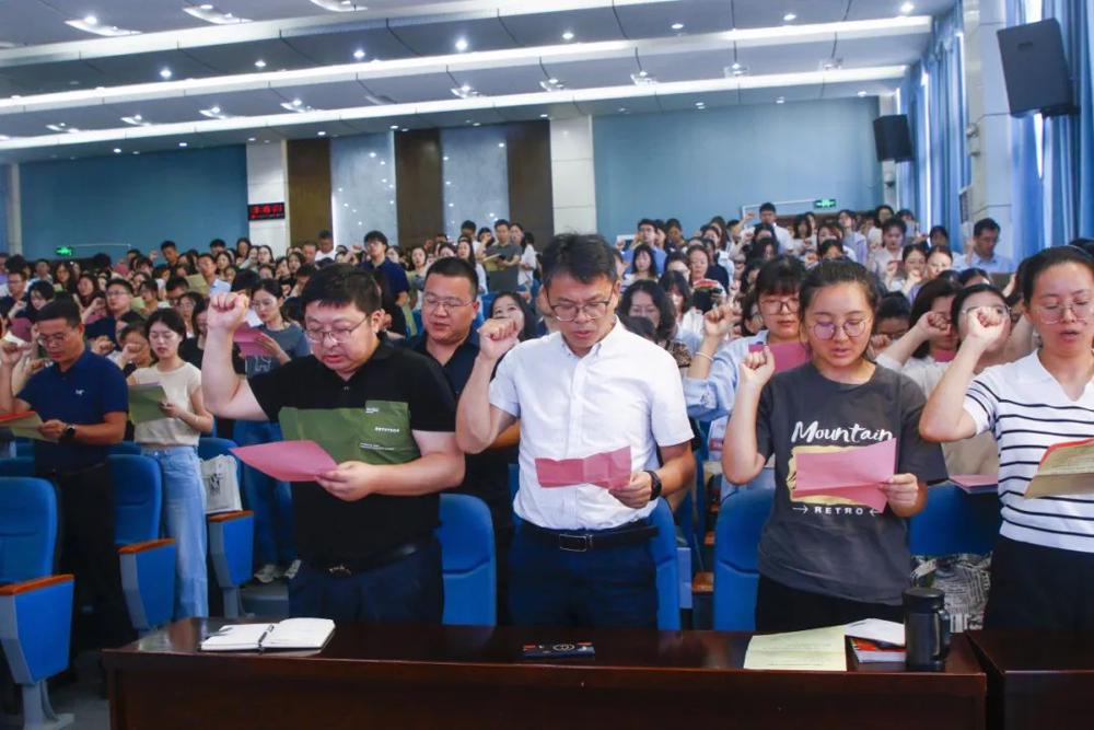 会议最后,党委副书记刘梅带领全体教师庄严宣誓。宣誓内容紧扣教育使命,明确全体教师将以 “有理想信念、道德情操、扎实学识、仁爱之心” 为标准,投身学校高品质特色高中创建,践行 “光大行知思想,学习斯霞品格” 的教育追求。宣誓结束后,全体教师现场签订《师德承诺书》与《拒绝有偿家教承诺书》,以书面形式筑牢师德防线。