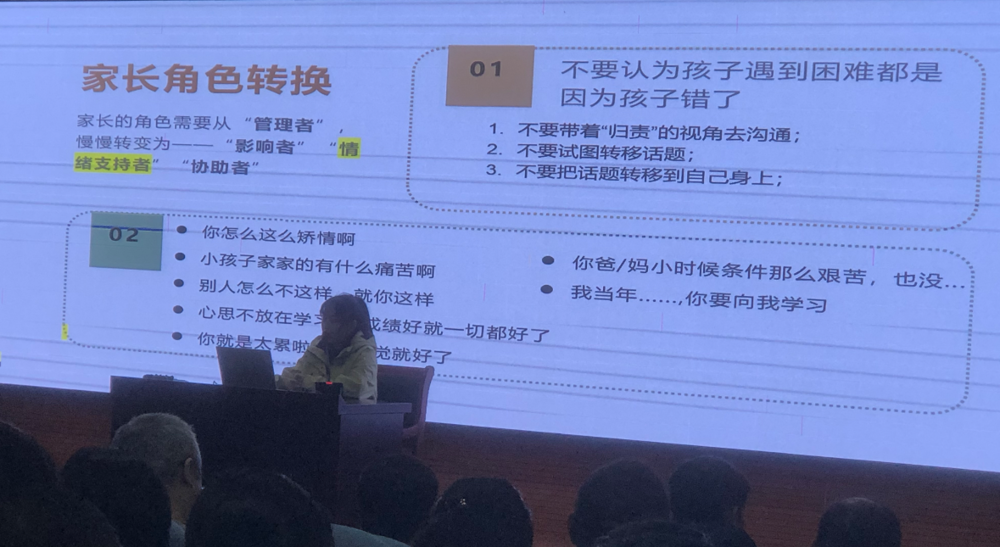心理老师胡玄一首先为家长们带来了题为《直面心理困境,助力孩子成长》的专题讲座。胡玄一老师为家长们提供了切实可行的教育建议。她强调,家长角色需从 “管理者” 逐步转变为 “影响者”“情绪支持者” 与 “协助者”,身教的作用远大于言传。