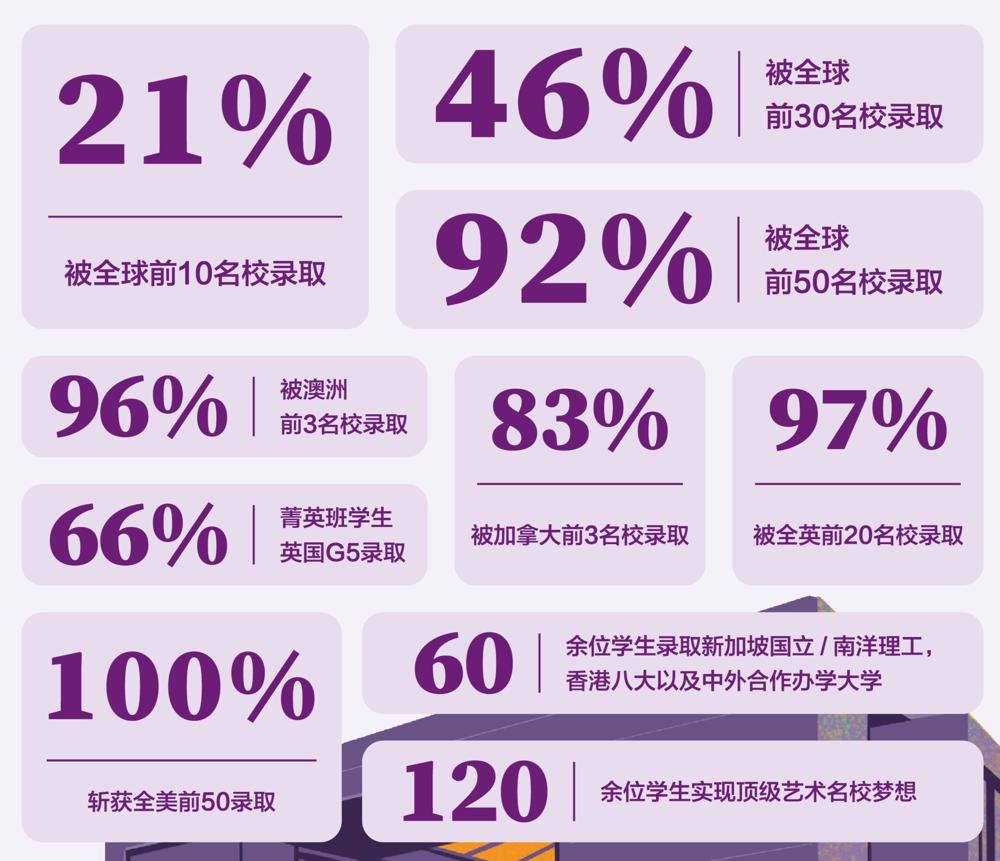 十余年来,千余位学生顺利完成三年国高课程,踏上海外求学征程,从雨中国高走向世界,历届毕业生共计斩获4600余封世界名校录取通知书,收获了来自英国、美国、加拿大、澳大利亚、德国、日本、新加坡、新西兰、荷兰等国家及中国香港、澳门地区的世界名校录取通知书——