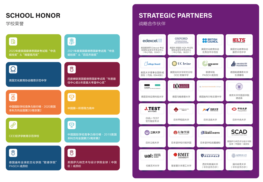 南京市雨花台中学国际高中(以下简称为雨中国高)被英国爱德思国家考试局授权为A Levels 国际课程学术考试中心,连续6年荣获爱德思“全国最佳中心”“中流砥柱奖”等荣誉奖项,目前是江苏省体量最大的A LEVELS教学及考试中心。同时,雨中国高也是英国文化教育协会优秀示范校,并获得美国大学理事会国际成员校资格,2018年挂牌成为美国加州大学欧文分校附属中学,2019年与德国马格德堡大学、帕德博恩大学深度合作,成为“歌德学院”PASCH成员校并开设德国方向课程班;2020年起先后与英国伦敦艺术大学、美国萨凡纳艺术与设计学院、日本法政大学、日本中央大学展开合作,开设艺术特色课程及日本方向课程班,进一步构建雨中国高独特的“国际融合课程”体系,为学生提供更多元的留学选择。