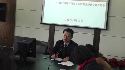 面对高考招生形势的新变化,为进一步明确方向,聚焦关键问题,加强合作,高三年级3月10号在第二会议室召开了2017届高三高考目标重新分解暨全体教师会,会议由梅岚主任主持。首先,邱荣主任根据近三年高考录取的情况,再结合我校的实际情况,给每个班级重新分配了奋斗目标,明确了努力的方向。接着,孙进副校长作工作指导,他先反馈了市教研室视导的相关情况,然后着重提出了在迎接二模的复习中我们要面向全体学生,关注重点人群,依纲据本,用头脑教学,用心思考,争取在二模中考出好成绩。最后,穆校长发表了重要讲话,他首先肯定了高三视导听课的情况,认为高三老师状态良好,课堂精彩,希望老师们在常态课中也能继续保持这样的水平。针对高考招生形势的变化,他强调大家要调整方法,激发斗志,调整教学,有的放矢,为雨中高考能再创新高而努力奋斗!