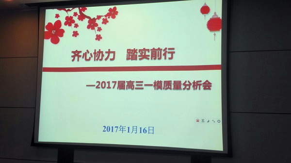 为及时反馈考试情况,更好地开展高三的复习工作,1月17号下午,高三年级在第二会议室召开了南京市一模考试质量分析会,会议由梅岚主任主持,全体高三老师参加了会议。首先,由邱荣主任进行质量分析,邱主任从三个方面分析了考试的数据,即和高考相关目标的比较,与部分学校的比较和校内的比较,既看到进步,也发现不足,为高三下一阶段的工作明确了方向。接着,孙进副校长发言,要求全体老师直面问题,迎头赶上,实现超越,他指出大家要提升信心,聚焦二轮复习,聚焦课堂和聚焦临界生。并布置了下一阶段的一些新举措。最后,穆校长发表重要讲话,他指出了高三的重要性,强调所有老师要发扬高三精神,全力以赴,关注每一个学生,精心上好每一节课,实现雨中新的跨越。