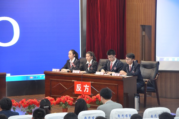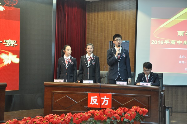4月12号下午,雨花台区“五四杯”辩论赛在雨花台中学和谐厅拉开了序幕。初赛的辩题是正方“知识积累比知识创新更重要”,反方“知识创新比知识积累更重要”。第一场比赛由雨花台中学辩论队作为反方对阵正方梅山高级中学辩论队。雨花台中学辩论队由高二的孙家莹、蔡梦颖、徐一啸、花增锐四位同学组成,他们从自我介绍时就突显了很强的团队合作精神,“择高处立,就平地坐,向宽处行”,一人一句校训,铿锵有力,形成一个整体。在一辩、二辩、三辩分别阐述自己的观点时,有礼有节,侃侃而谈,逻辑清楚,层次分明。在自由辩论阶段,双方你来我往,唇枪舌剑,妙语连珠,观众掌声不断,气氛非常热烈。总结陈词时,四辩总览全局,以生动幽默的语言,再次巩固和强化了本方的观点。最后,雨花台中学辩论队以精彩的表现获胜,四辩花增锐同学和正方四辩获得了本场比赛最佳辩手的称号。胜利的背后是艰辛的付出,全体辩论队成员在方云和周勇两位老师的指导下,广泛地搜集资料,不停地讨论,几易其稿,模拟辩论,最终取得了好的成绩。4月19号,雨花台中学辩论队将会对阵在第二场比赛中获胜的板桥中学辩论队,期待他们再接再厉,再创佳绩。