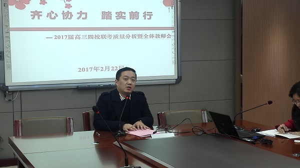 2月22日中午,高三年级在国际部二楼会议室召开了四校联考质量分析会暨全体教师会,会议由梅岚主任主持。首先,邱荣主任从两个方面对本次考试进行质量分析。一是各校之间的对比,从语数外分数段和均分方面进行了翔实客观的分析。二是对校内班级目标完成情况和语数外均分进行对比分析。在对比中发现问题,找出增长空间,为后面的复习指明方向。接着孙进副校长布置了下一阶段的一些主要工作,并就限时练、午练和晚练提出了具体的要求,他指出要精心编制练习卷,统一格式,确保质量,精讲精练,并严格管理。他还在会上强调,在距离高考还有一百多天的时候,要更关注时间和效率,关注细节,用态度、能力和智慧,在最短的时间内,取得最大的成绩。