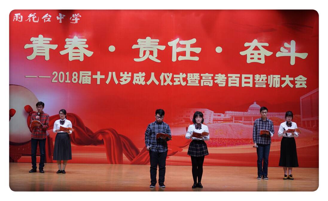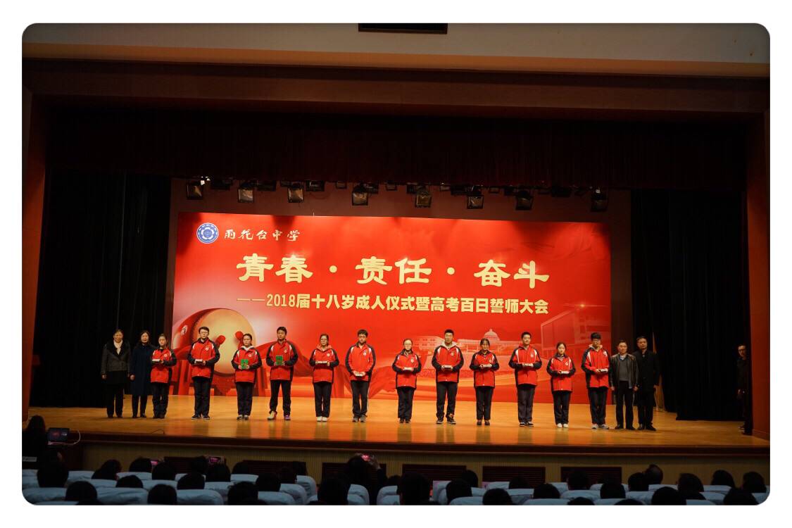 2018年2月27日下午,雨花台中学举行了以“青春 责任 奋斗”为主题的2018届十八岁成人仪式暨高考百日誓师大会。高三年级全体同学、教师以及家长近千人参加了此次活动。