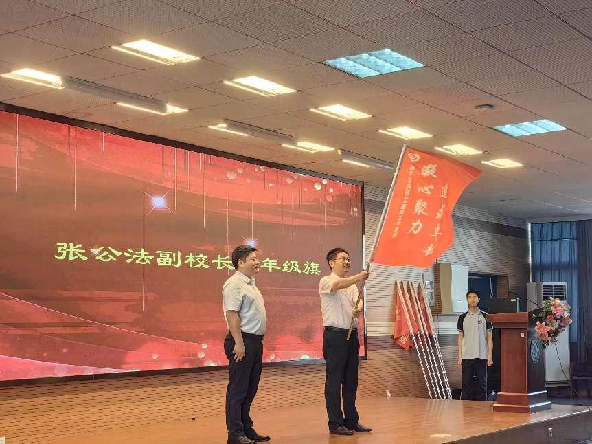 接着,张公法副校长向高三年级部主任勾俊华主任授予年级旗,勾俊华主任向各班旗手授予班级旗。旗手们接过旗帜,各班同学们响亮的口号声响彻报告厅,这两面旗帜象征着我们步入高三的决心和使命。高三(1)班丁晟同学带领高三全体同学宣誓,声声誓言展现了雨岱2024届誓登金榜、创造辉煌的信念和决心!