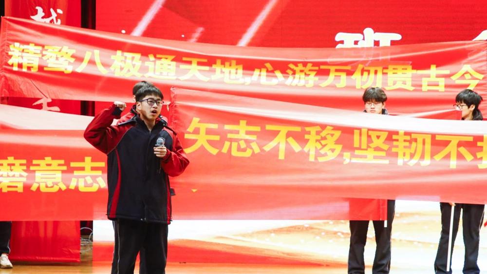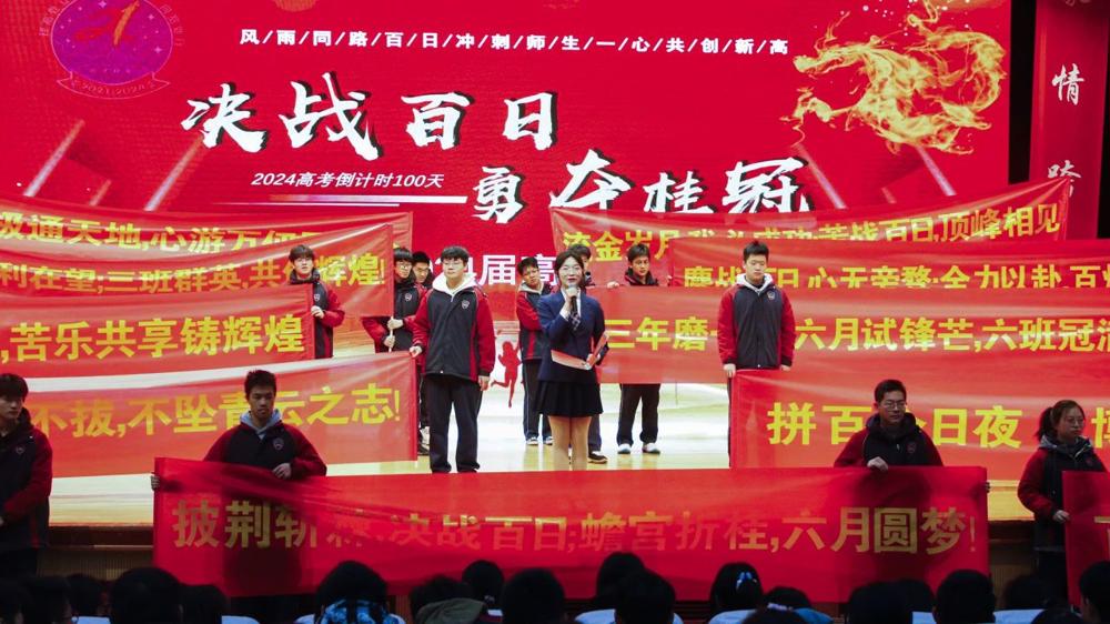2024年2月28日7点08分,在距离高考仅剩百天之际,我校高三年级部全体师生在学术会堂隆重举行"决战百日,勇夺桂冠"2024届高三百日誓师大会。赵光辉校长、高三全体师生、家长代表共赴这场活动,见证了这一庄严而神圣时刻。会议由高三(2)班李熙智同学主持。本次大会的内容如下: