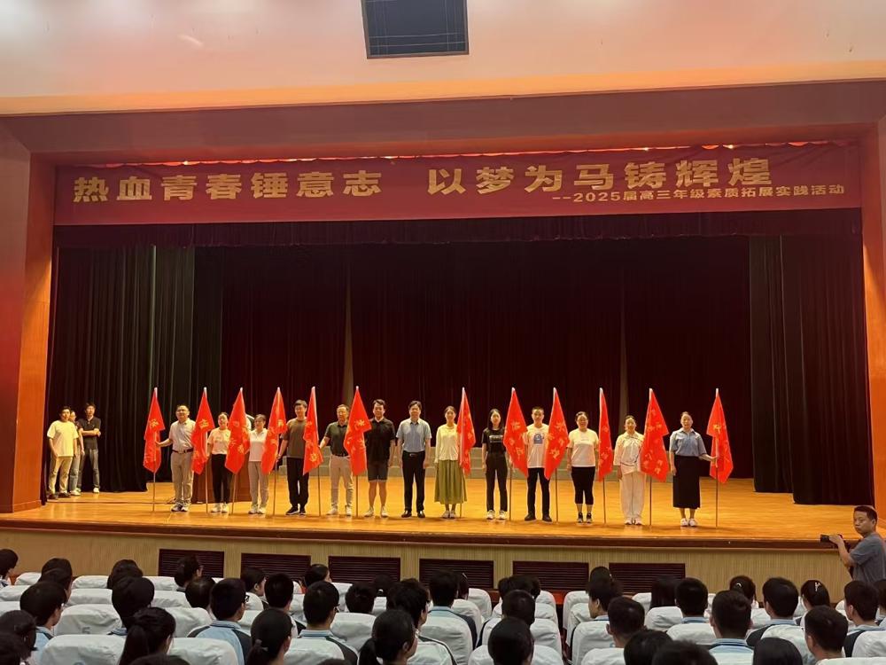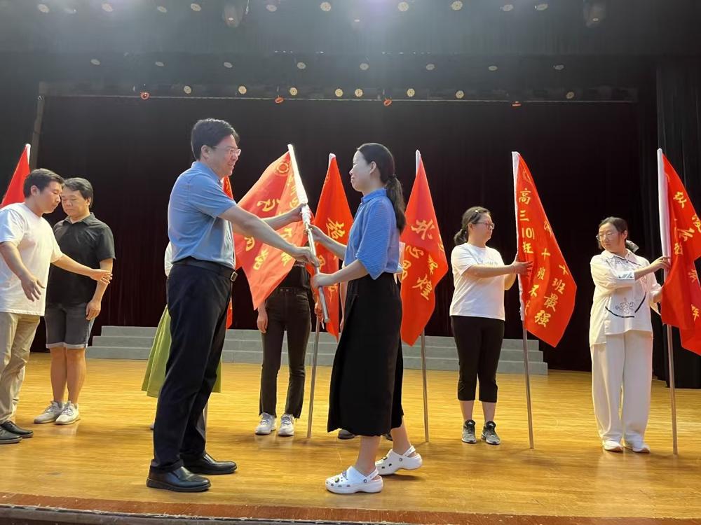 接着,赵光辉校长为新高三各班授予班旗,各班班主任依次上台,从校长手中接过班旗,迎学生而立。每面旗帜都在灯光下熠熠生辉,班旗上印刻的口号承载着每个班级孩子们的梦想与憧憬。