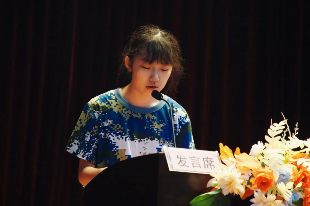 来自高一(8)班的孙翌涵同学作为学生代表上台发言,她代表全体新生表达了对军训的期待与决心,