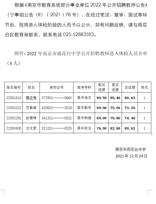 2022年南京市雨花台中学公开招聘教师进入体检人员名单公示