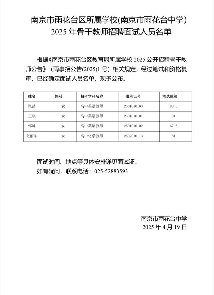 南京市雨花台区所属学校(南京市雨花台中学) 2025 年骨干教师招聘面试人员名单