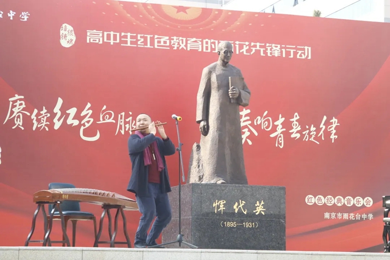 在恽代英雕塑前,雨中学子用钢琴、古筝等乐器奏响一首首芳华永驻的红色歌曲,献上一曲曲党的颂歌:《井冈山上太阳红》、《山丹丹开花红艳艳》、《我和我的祖国》……一段段耳熟能详的旋律将少年心中的爱国主义情怀娓娓道来。
