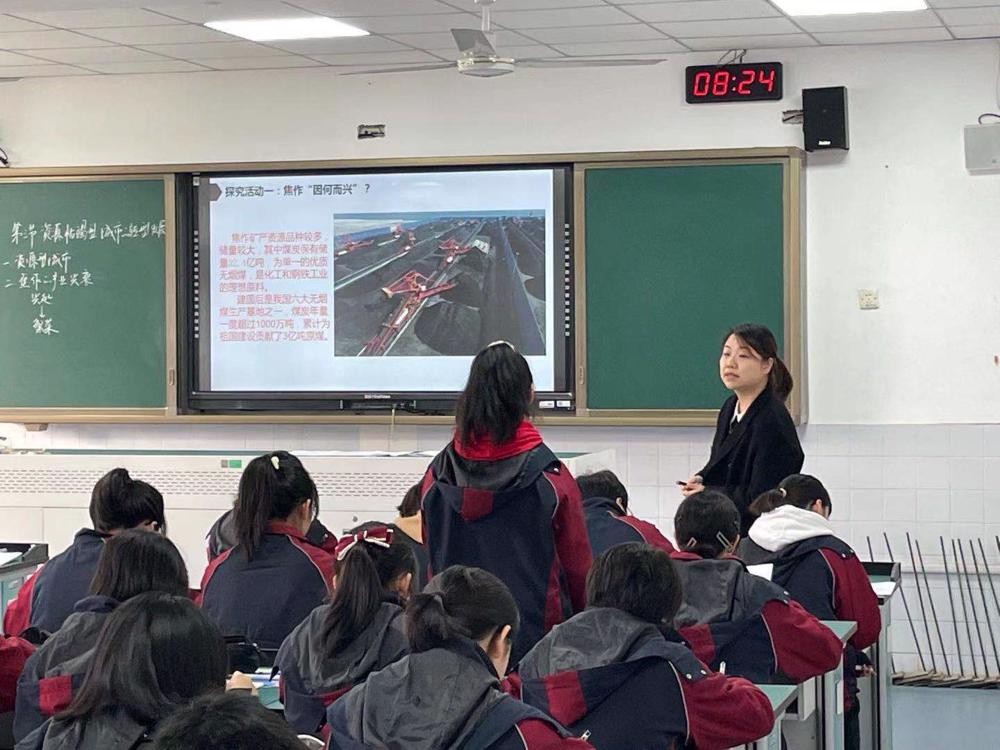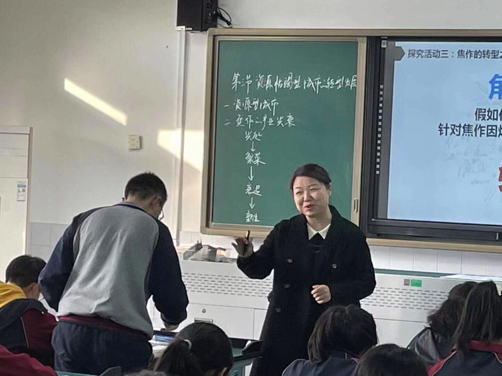 两位老师依据课程标准,以焦作市为例,结合学案,引导学生探究资源型城市的兴衰和今后的发展方向。首先登场的是赵老师,她通过焦作市的发展兴衰引出了资源型城市的生命周期。而接下来的孙兵老师先是通过辽宁阜新的案例总结出了资源型城市的一般生命周期,再结合焦作进行实例分析,是从一般到特殊。