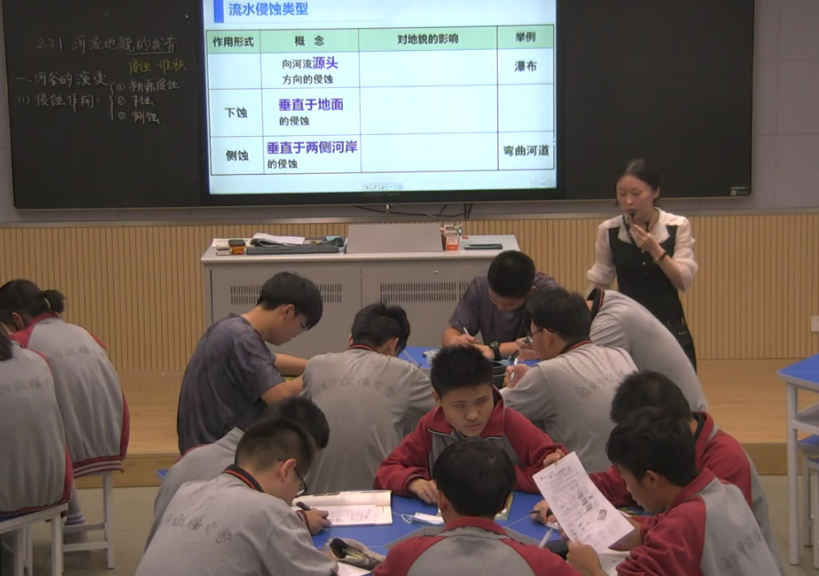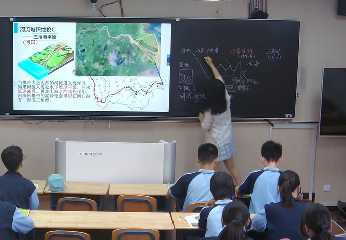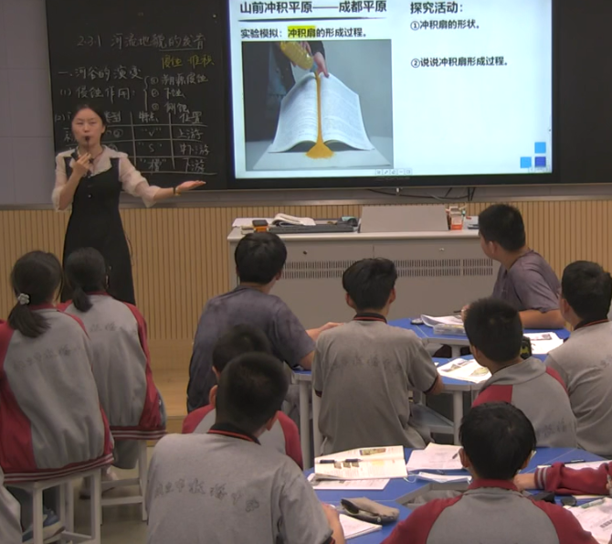 向莉老师的这节课是雨花台区名特优展示课。她从小明和教授的研学活动出发,带领同学们探寻不同河段的河流地貌。再通过实验的视频展示,帮助学生更好地理解不同的侵蚀方式给河流地貌带来的影响。最后通过对比长江、钱塘江和黄河入海口处的河流地貌,来说明三角洲的形成与自然及人类活动之间的联系。课中,学生的参与度较高,相信本节课学生的学习目标达成得很好。