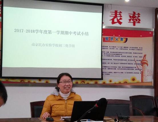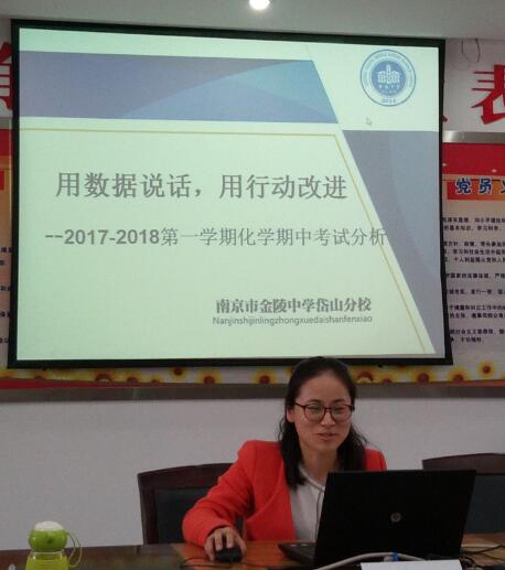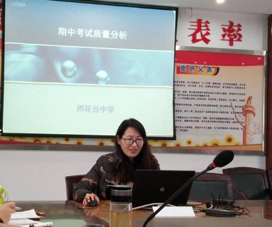 首先汇报的是我区学生最多的雨花台中学的李娜组长,李组长从学校的优分率、及格率、低分率进行了具体分析,并和区排名第一的一中实验学校进行了数据对比。李组长通过比较发现雨中的主要问题在于低分人数较多,在接下来的教学中,不仅要保持优分率及格率,更重要的是分人头关注各班的学困生,尽量减少低分人数,力争期末考试拿到区第一!