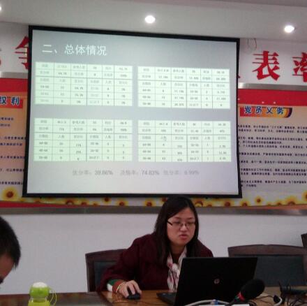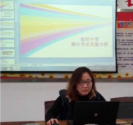 一中实验的周老师代替组长发言。一中实验学校本次考试区排名第一。周老师同样也和雨中的各项数据进行了对比,虽然仍是区第一,但是发现雨中的势头很猛,较去年的差距4分变为现在的0.89分,有相当的紧迫感!接着周老师介绍了学校的总人数和班级基本情况。借助数据总结了现在学生存在的问题,也根据数据制定了后期的改进措施。