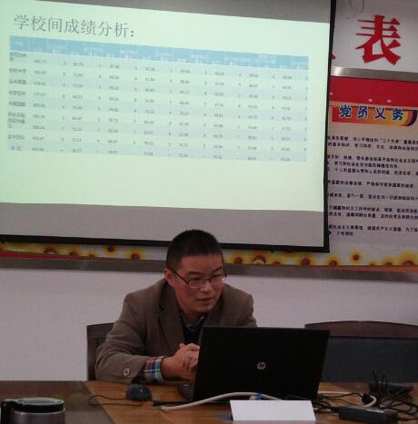 金中岱山分校的郑组长也是从学校基本情况出发,汇报了班级情况和班级考试情况。具体汇报了考试的可取之处和后期的改进措施,特别提到要准备考试的有效复习,研究中考和学生。郑组长汇报时情绪激昂,对期末的考试情况充满信心,希望在期末的考试中带领学校跻身区前三!