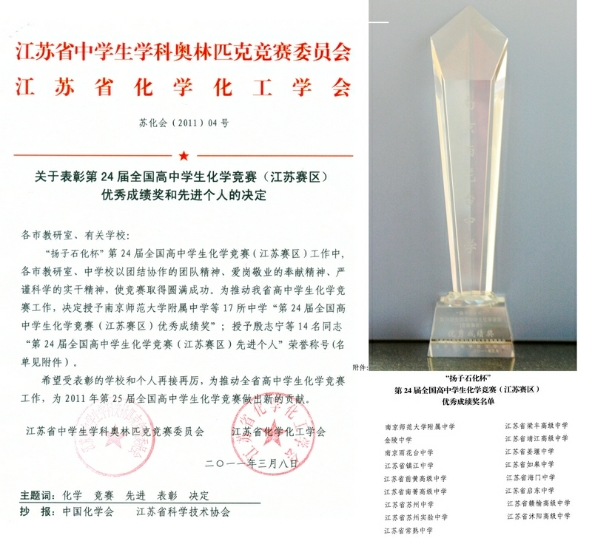 届全国高中学生化学竞赛(江苏赛区)优秀成绩奖,获此殊荣的南京仅三家学校:南师附中、金陵中学和雨花台中学,特此报喜!