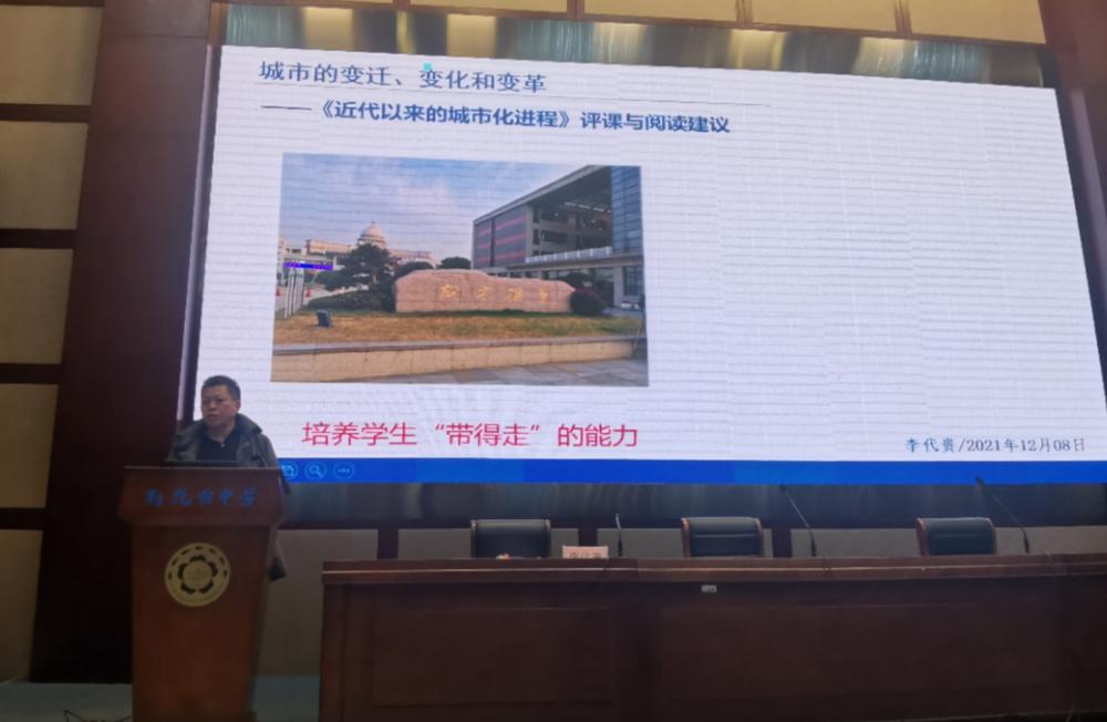 2021年12月8日,溧水高级中学刘夏亲老师和雨中来平老师在雨花台中学开设了选必修二《近代以来的城市化进程》进行“同课异构”。课后,省特级教师,正高级教师李代贵老师对两节课作了精彩的点评。李老师评价两位老师亲和力强,能与学生进行积极的互动。教师完美做到了倾诉与表达的衔接;课程内容取材丰富;教师教学素养高。两节课异曲同工,都将南京城作为导入和引线,一气呵成,贴近生活。来平老师的学科素养自然的流露在教学的细节中。评课结束后,李老师还给与会老师作了基于评课的历史阅读建议微讲座。培养学生带的走的能力,李老师鼓励全体历史老师教师学会从学生的视角学习,像学者和命题专家一样去思考。新课程,新高考,所有历史同仁砥砺前行!