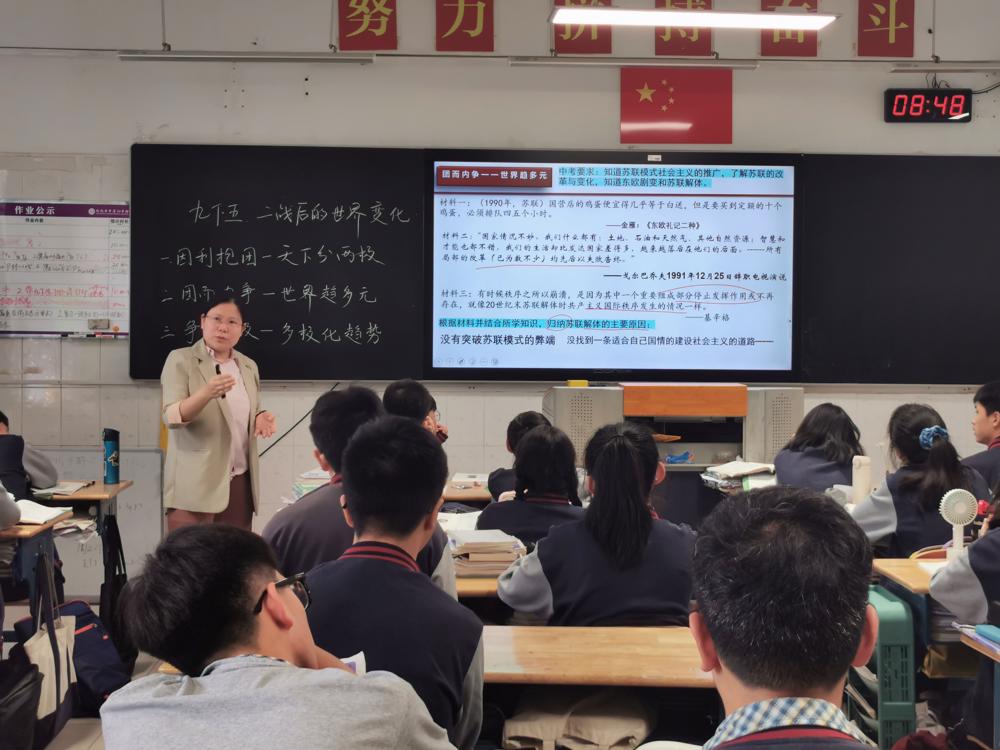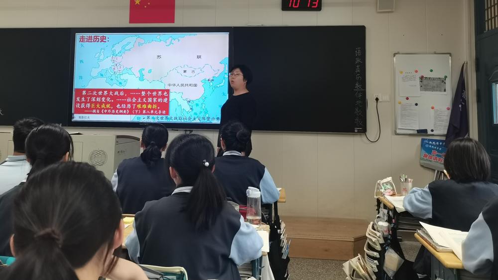 我校初中部孙洁老师和高中部诸雯莉老师分别在初高中开设了《二战后的世界变化》和《社会主义国家的发展与变化》的研究课。孙洁老师以丘吉尔这一历史人物融入初三一轮复习中,展示了微观史学下初中历史复习课的新模式。诸雯莉老师以微观经济和社会生活的视角引领学生分析二战后社会主义国家的改革,注重培养学生历史叙事能力。