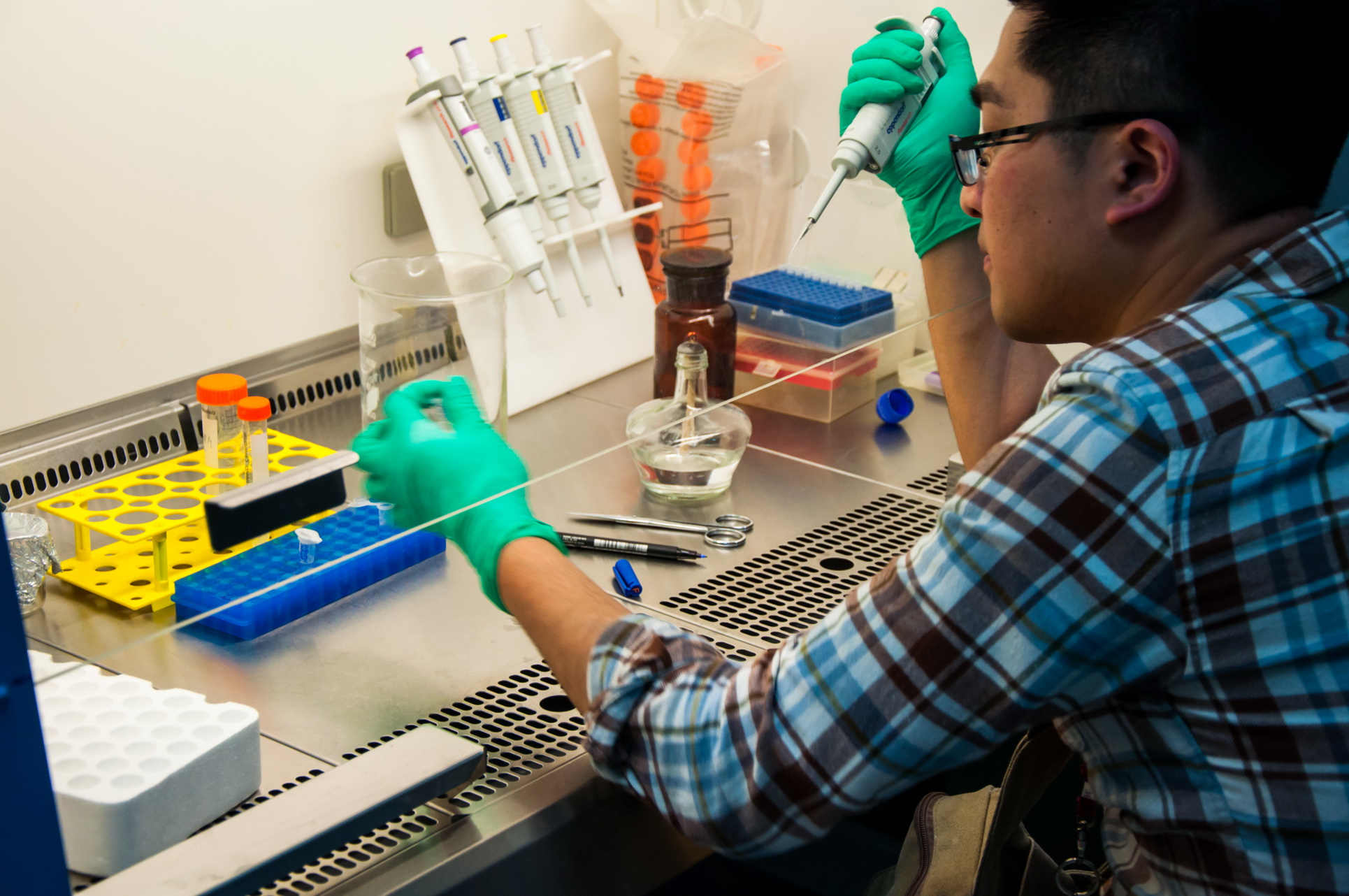 来到南京中医药大学唐仲英科技楼以后,我们在实验室朱老师的带领下参观了分子免疫实验室、组织和细胞培养实验室、生物功能实验室、神经化学与神经免疫学实验室等。并观摩了超净工作台、PCR仪、高速离心机、小型垂直电泳系统、实时荧光定量PCR仪、紫外可见分光光度计、荧光显微镜、倒置显微镜、冷冻切片机、恒温培养箱、超低温冰箱、双光子配套仪器-膜片钳放大器系统、双光子配套仪器-动物行为学实验仪器等设备的使用方法。在朱老师的介绍下,我们还了解了实验室最近的研究项目“药物对痛、痒觉神经元的作用”。最后,在韩明月老师的带领下,我们实践了目的基因的PCR及克隆实验。