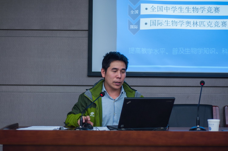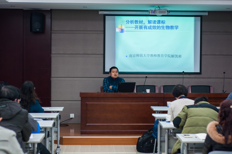 2015年12月22日南京市生物教研组长研训活动在我校国际部四楼报告厅举行,活动邀请了两位南京大学教授和南京师范大学教师教育学院解凯彬老师进行讲学,我校蒋勇老师与全市的教研组长交流了我们生物组的教研特色。