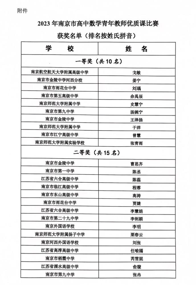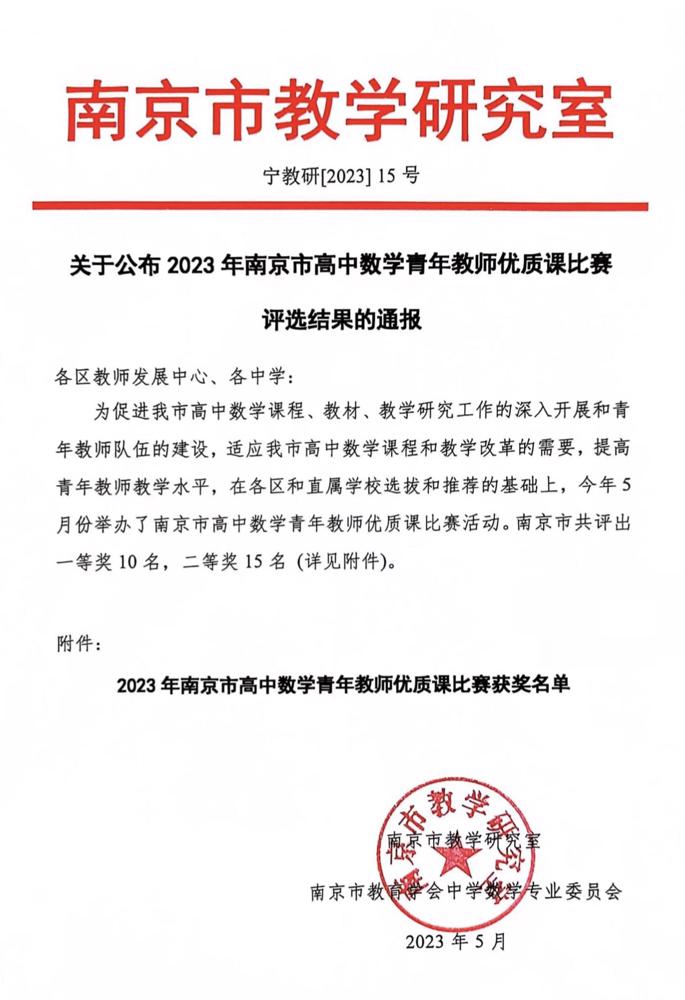 喜报!热烈祝贺数学组2名教师荣获2023年南京市高中数学青年教师优质课比赛一等奖和二等奖