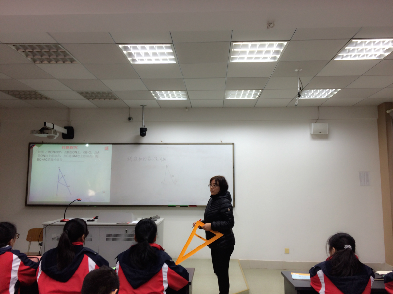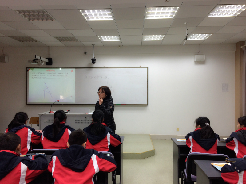 2016年12月15日上午,初中数学教研组全体老师参加了课题研训活动,该课题是江苏省教学研究立项课题:初中数学“综合与实践”教学的校本化研究,本次活动由教研组长安勇老师主持. 本次活动先由沈丽老师开设了一节课题研究课,题目为《线段和的最小值问题》,沈老师采用了一题一课的形式,开篇以一道富有挑战性的题目引入,激发了学生兴趣,接着通过学生自主探究、合作交流和投影展示等方式成功的完成了本节课的教学内容,使学生的数学思维得到了充分的发展,让学生在探究中感悟到了轴对称的性质对于解决动点最值问题的价值所在.整节课课堂气氛活跃,精彩纷呈,受到听课老师们的一致好评.接着,参加活动的老师对本节课展开了热烈的讨论.最后,由杭秉全老师对课题实验阶段研究的分工做了详细的布置. 本次活动既是一次课题组老师展示课堂教学水平的机会,又是一次数学组老师学习交流的机会,同时也对教研组老师教学研究水平的提高起到了积极的引领作用!