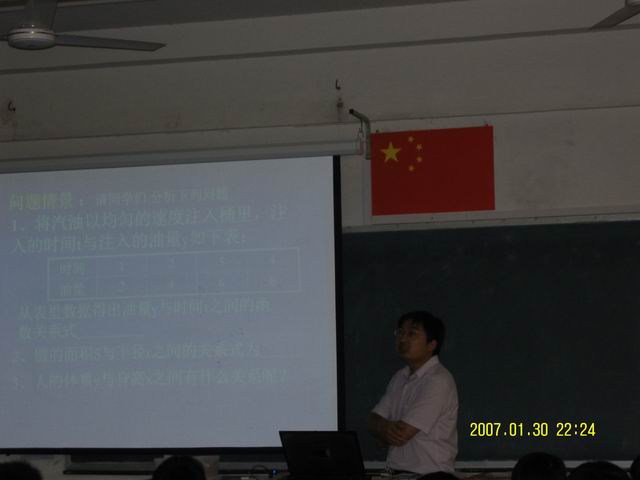 2008年9月23日下午,我校数学教研组开展了本学期的第二次教研活动,此次会议分为两个部分:首先是下午第二节课全体教师观摩了张居强老师的示范课《线性回归方程》,张老师诙谐幽默的语言和活跃的课堂气氛让我们的老师收获颇多。第三节课全体教师在学术交流中心进行了评课,各位老师都发表自己的看法,一致认为从本节课中得到了很大的收获。接着瞿田东老师向大家介绍了参加苏州新课程改革专家会议精神,通过交流让全体参会老师对新课改理念有了更深的理解,对以后的教学有着更好的指导作用。