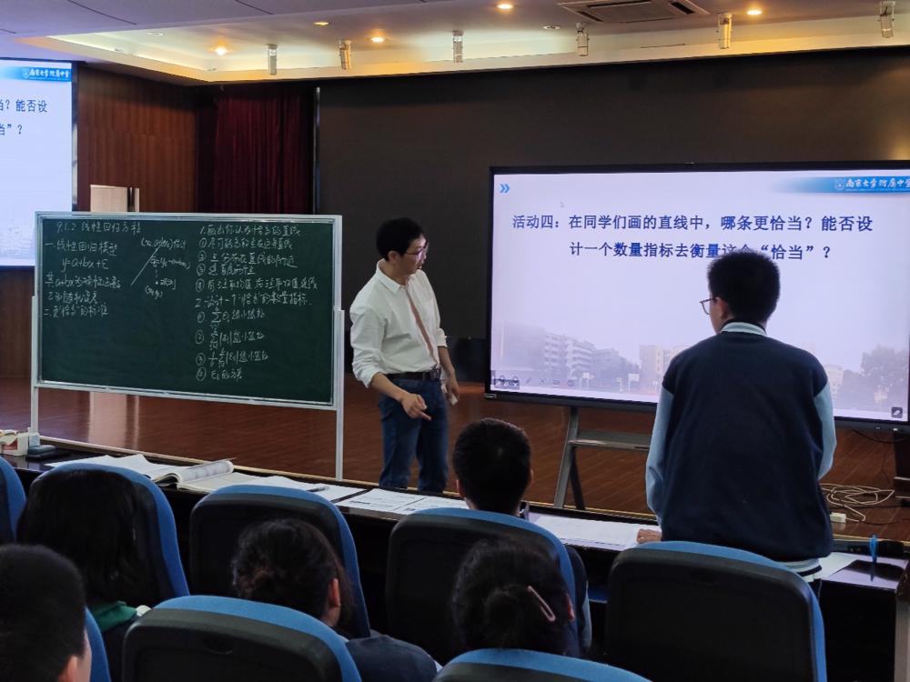第一节课由南京大学附属中学的张子超老师执教,课题是《线性回归方程》。张老师从近期南京市多个监测点风速为情境,教学生学会思考,引入本节课内容,在探究猜想中,构建数学,运用数学知识解决实际问题,作出预测,是一节精彩的课。