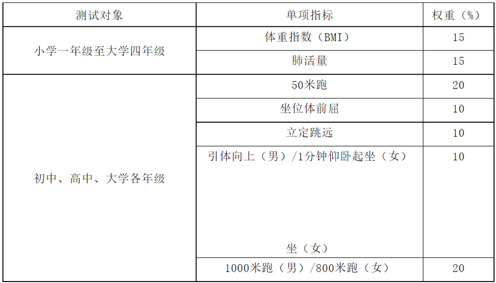 5.小学、初中、高中、大学各组别的测试指标均为必测指标。其中,身体形态类中的身高、体重,身体机能类中的肺活量,以及身体素质类中的50米跑、坐位体前屈为各年级学生共性指标。