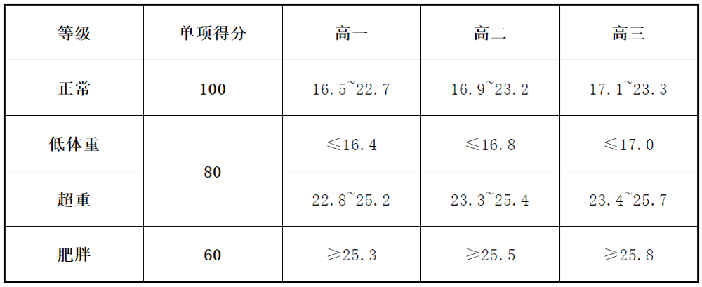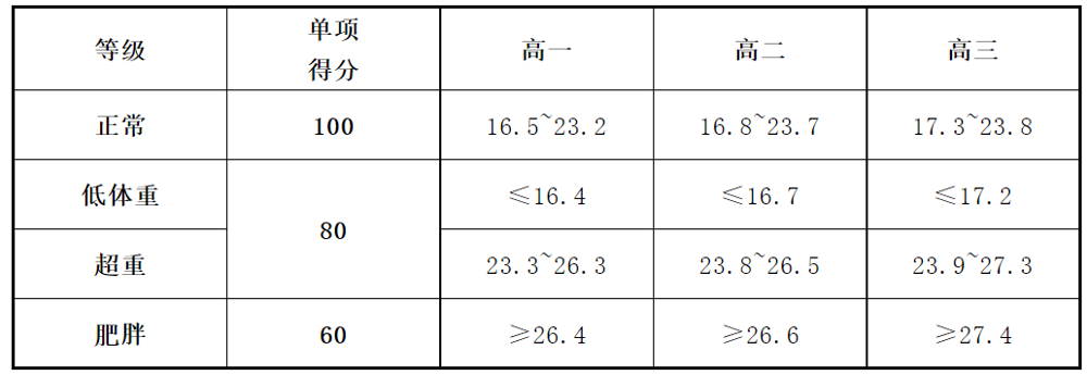 表1-1 男生体重指数(BMI)单项评分表(单位:千克/米2)