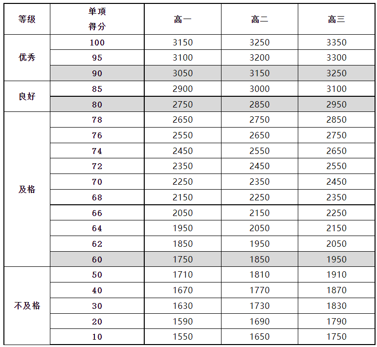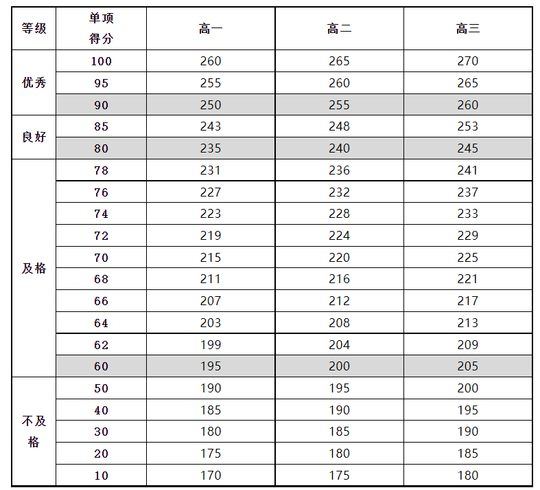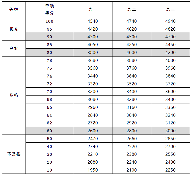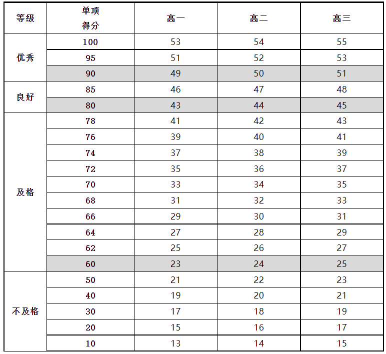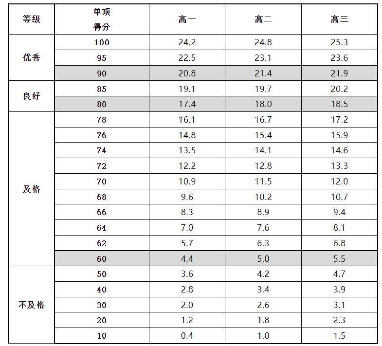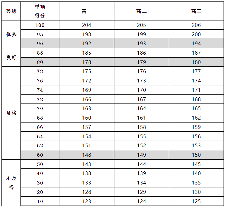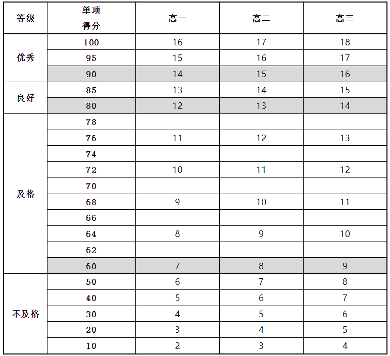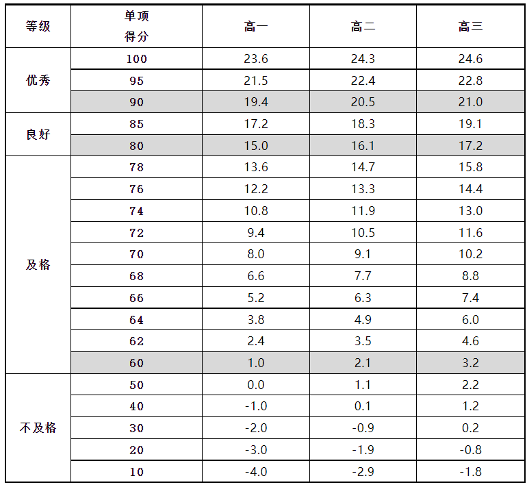 注:引体向上、一分钟仰卧起坐均为高优指标,学生成绩超过单项评分100分后,以超过的次数所对应的分数进行加分。
